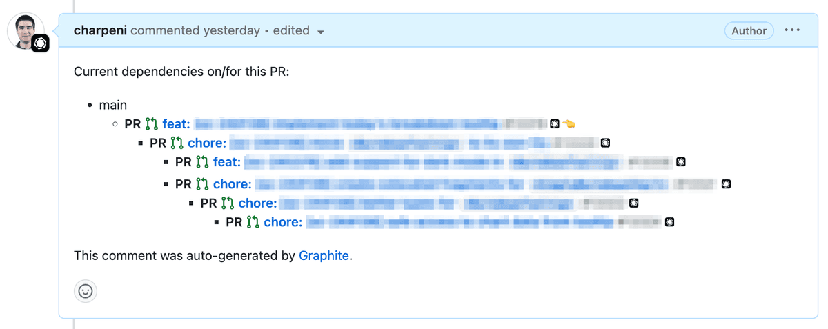 One last example of where Graphite was useful is with a library we had to upgrade, and we were multiple versions behind with a significant number of breaking changes. We made a stacked pull request for every major bump. Therefore, it was a breeze to review as you just had to check the release notes and migration guides and compare the diff rather than reading ten migration guides and tracking relevant changes within a single pull request.
